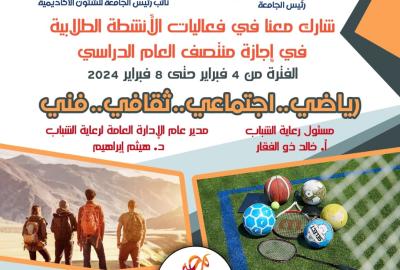 إدارة الاتحادات الطلابية وإدارة اعداد القادة بالتعاون مع اتحاد طلاب الجامعة وأسرة طلاب من أجل مصر برنامج قادة -وقيادة -قادة من أجل مصر خلال أجازة نصف العام في الفترة من ٣ فبراير حتي ٧ فبراير ٢٠٢٤