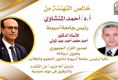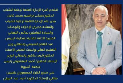 الادارة العامة لرعاية الشباب .. تتقدم بخالص التهاني بصدور قرار فخامة الرئيس عبد الفتاح السيسي بتعيين معالي ا.د أحمد عبد المولي نائباً لرئيس جامعة أسيوط لشئون التعليم والطلاب