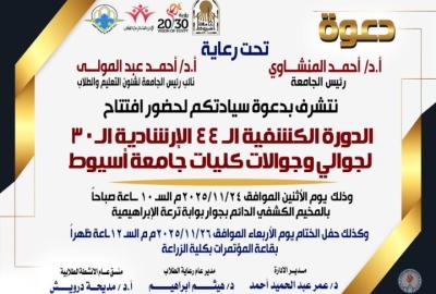 إدارة الجوالة والخدمة العامة بالإدارة العامة لرعاية الطلاب.. دعوه لحضور أفتتاح الدورة الكشفية الـ٤٤ الإرشادية الـ٣٠ لجوالى وجوالات كليات جامعة أسيوط