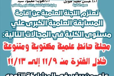 كلية التربية- تعتزم اللجنة العلمية عن إقامة مسابقة ( مجلة حائط علمية مكتوبة ومتنوعة )