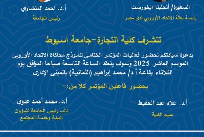 كلية التجارة جامعة أسيوط ... تتشرف بدعوة سيادتكم لحضور فعاليات المؤتمر الختامي لنموذج محاكاة الاتحاد الأوروبي الموسم العاشر 2025