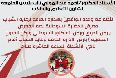 دعوه للحضور . تنظم وحدة الطلاب الوافدين بالادارة العامة لرعاية الشباب المركزية معرض الحضارة السودانية يضم المعرض " ركن الجرتق وركن الفلكلور السوداني وركن الفنون الشعبية " وذلك أمام نادي الأنشطة الطلابية الساعة 10 صباحا .
