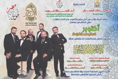 جامعة اسيوط ... تنظم أسرة طلاب من أجل مصر بالتعاون مع اتحاد طلاب الجامعة حفل العاشر من رمضان " اكتوبر أسترداد الكرامة " يوم الأحد ١٠ ابريل الساعة ٩ مساء ليلة العاشر من رمضان بأرض المخيم الكشفى بالجامعة