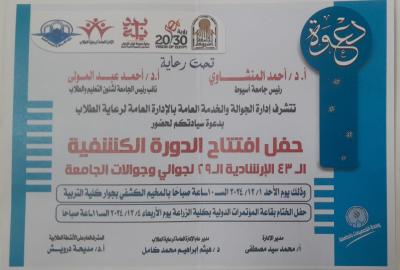 إدارة الجوالة والخدمة العامة بالادارة العامة لرعاية الطلاب .. تتشرف بدعوة سيادتكم لحضورحفل إفتتاح الدورة الكشفية ال 43 الارشادية ال 29 لجوالى وجوالات الجامعة وذلك يوم الاحد 1 ديسمبر 2024 الساعة 10 صباحا بالمخيم الكشفى بجوار كلية التربية و حفل الختام