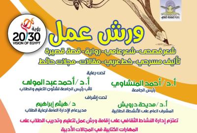 ادارة النشاط الثقافى بالادارة العامة لرعاية الطلاب .. ورش عمل شعر فصحى - شعر عامى - رواية - قصة قصيرة - تأليف مسرحى - خط عربى - مقالات - مجلات حائط