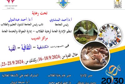 إدارة الجوالة والخدمة العامة بالإدارة العامة لرعاية الطلاب .. دعوة لمشاركة الطلاب في مراكز التدريب في المهارات الكشفية والثقافية والفنية خلال الفترة من ١٦ الى ١٨ سبتمبر وكذلك ايضل خلال الفترة من ٢٣ الى ٢٥ سبتمبر