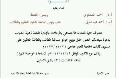 دعوة .. إدارة النشاط الإجتماعى والرحلات بالادارة العامة لرعاية الشباب .. تتشرف بدعوة سيادتكم لحضور حفل توزيع جوائز مسابقة الطالب والطالبة المثاليين على مستوى كليات الجامعة فى العام الجامعى 2022 / 2023م