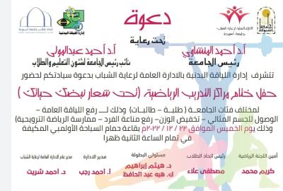 دعوة .. ادارة اللياقة البدنية بالادارة العامة لرعاية الشباب .. تتشرف بدعوة سيادكم لحضور حفل ختام مراكز التدريب الرياضية تحت شعار " نبضك حياتك" طلبة - طالبات . كليات جامعة اسيوط