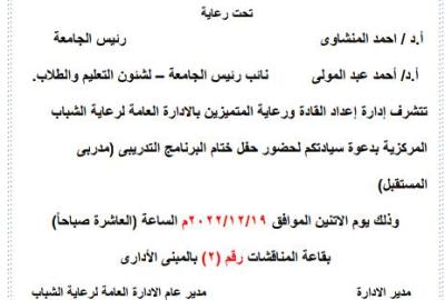 تتشرف ادارة اعداد القادة ورعاية الطلاب المتميزين بالادارة العامة لرعاية الشباب المركزية بدعوة سيادكم لحضور حفل ختام البرنامج التدريبى " مدربى المستقبل "وذلك يوم الاثنين الموافق 19 ديسمبر2022 م العاشرة صباحا بقاعة المناقشات رقم ( 2 ) بالمبنى الادارى