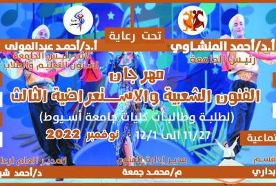 ادارة الفنون ... تعلن عن مهرجان الفنون الشعبية والاستعراضية الثالث " لطلبة وطالبات كليات جامعة اسيوط " خلال الفترة من 27 نوفمبر الى 1 ديسمبر 2022م