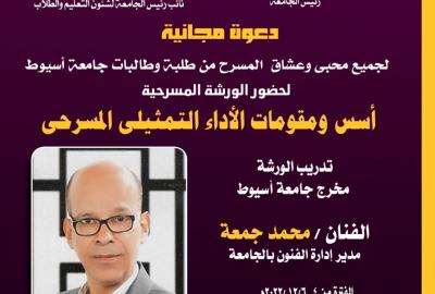 إدارة الفنون .. دعوة مجانية لجميع محبى وعشاق المسرح من طلاب جامعة اسيوط لحضور الورشة المسرحية " أسس ومقومات الأداء التمثيلى المسرحى " عزيزى الطالب بادر بتسجيل إسمك لدى قسم الفنون المسرحية واستيفاء الاستمارة المطلوبة ، يحصل المتدرب على شهادة تقدير معتمدة.