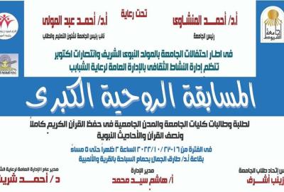 الادارة العامة لرعاية الشاب - ادارة النشاط الثقافى ... تعلن عن بدء فعاليات المسابقة الروحية الكبرى فى حفظ القرآن الكريم والثقافة الإسلامية والأربعين حديث نبوية لجميع طلبة وطالبات جامعة اسيوط.