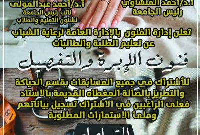 تعلن الإدارة العامة لرعاية الشباب إدارة الفنون .. عن تعليم الطلبة والطالبات فنون الإبرة والتفصيل الاشتراك فى جميع المسابقات بقسم الحياكة والتطريز بالصالة المغطاة القديمة .فعلي الطلاب الراغبين في الاشتراك تسجيل بياناتهم وملئ الاستمارات المطلوبة
