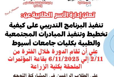 كلية التربية- تعلن الإدارة العامة لنشاط الأسر الطلابية عن تنفيذ البرنامج التدريبي على كيفية تخطيط و تنفيذ المبادرات المجتمعية والطبية بكليات جامعة أسيوط