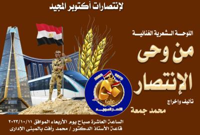 تنظم إدارة الفنون بالإدارة العامة لرعاية الشباب لوحة شعرية غنائية بمناسبة احتفالات جامعة أسيوط باليوبيل الذهبي لإنتصارات أكتوبر بعنوان " من وحي الإنتصارات"