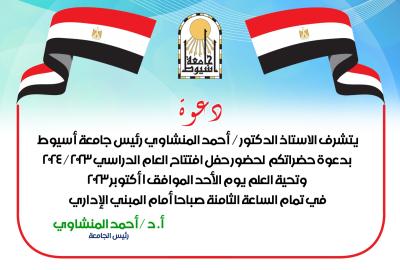 دعوة يتشرف الاستاذ الدكتور / أحمد المنشاوى رئيس جامعة اسيوط بدعوة حضراتكم لحضور حفل افتتاح العام الدراسى 2023/2024 وتحية العلم يوم الاحد الموافق 1 اكتوبر 2023 فى تمام الساعة الثامنة صباحا امام المبنى الادارى
