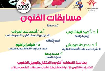 اعلان هام .. إدارة الفنون ... بمناسبة انتصارات اكتوبر والاحتفال باليوبيل الذهبي تعلن الادارة العامة لرعاية الشباب لطلاب جامعة اسيوط عن مسابقات الفنون فى مجالات " الاغنية . الرسم والتصوير وتصميم البوستر . الكاريكاتير . الحياكة والتطريز "