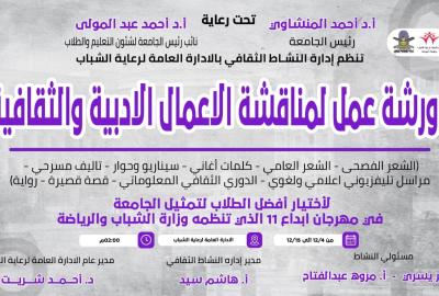 تنظم الإدارة العامة لرعاية الشباب - ادارة النشاط الثقافي .. ورشة عمل لمناقشة الأعمال الادبيه والثقافيه في مجالات " الشعر الفصحي_الشعر العامي_كلمات اغاني _سناريو وحوار _تاليف مسرحي _مراسل تليفزوني اعلامي ولغوي _الدوري الثقافي المعلوماتي _قصه قصيره_روايه "