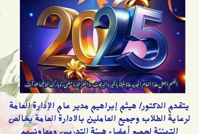 يتقدم الدكتورهيثم إبراهيم مدير عام الادارة العامة لرعاية الطلاب بالتهنئة لجميع السادة أعضاء هيئة التدريس ومعاونيهم والعاملين والطلاب بجامعة أسيوط بمناسبة العام الميلادي الجديد ٢٠٢٥م