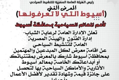 تعلن الادارة العامة لرعاية الشباب..ادارة الفنون والهيئة المصرية العامة للتنشيط السياحى عن اقامة المعرض الفني لكل المبدعين والمهتمين بعنوان "اسيوط التى لا تعرفونها" لاهم المعالم السياحية بمحافظة اسيوط ،شارك لتحصيل على جائزة قيمة وشهادة تقدير لاجمل الاعمال