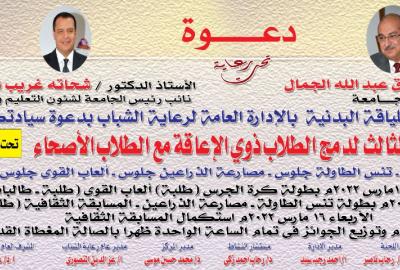 إدارة اللياقة البدنية ... دعوة لحضور المهرجان الرياضى الثالث لدمج الطلاب ذوي الإعاقة مع الطلاب الأصحاء . تحت شعار " قلب واحد "