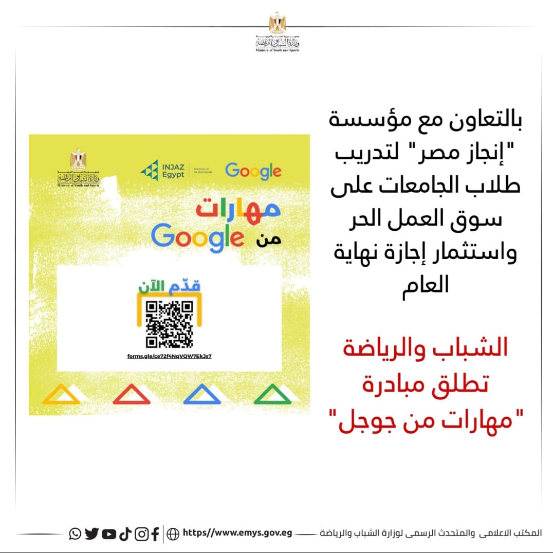 أطلقت وزارة الشباب والرياضة، مبادرة "مهارات من جوجل"، بالتعاون مع مؤسسة "إنجاز مصر" وبرعاية شركة جوجل.