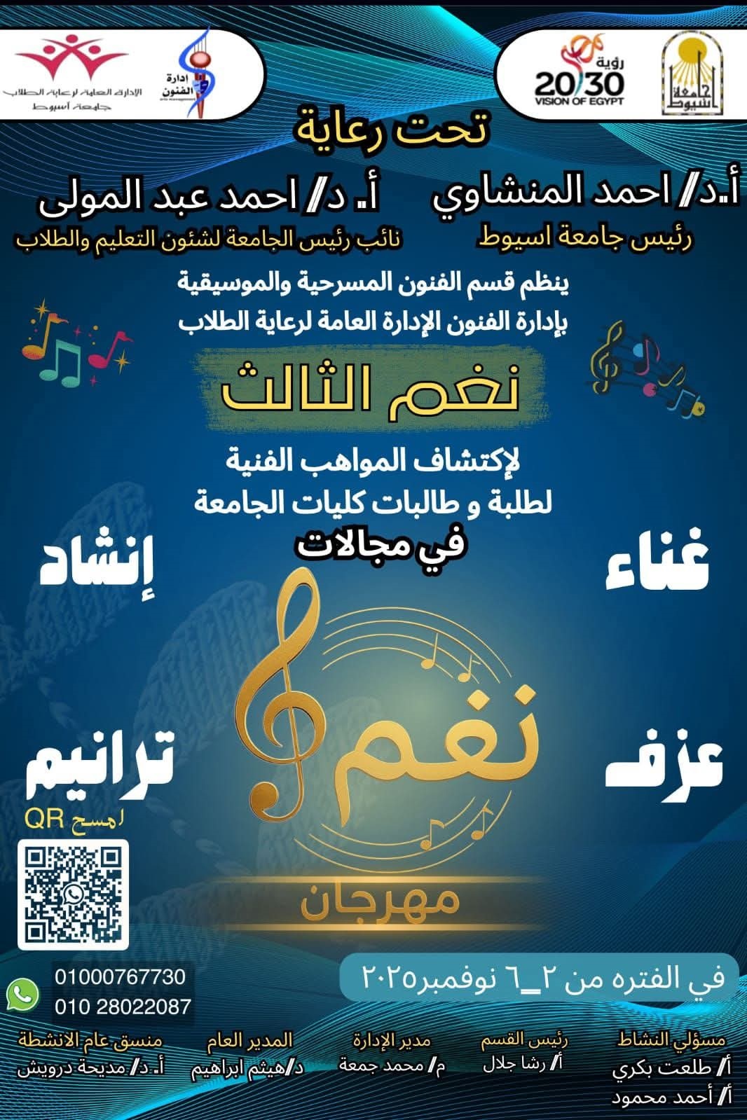 ينظم قسم الفنون المسرحية والموسيقية بإدارة الفنون الأدارة العامة لرعاية الطلاب  " نغم الثالث "  لإكتشاف المواهب الفنية لطلبة وطالبات كليات الجامعة فى مجالات  " غناء - عزف - إنشاد - ترانيم "